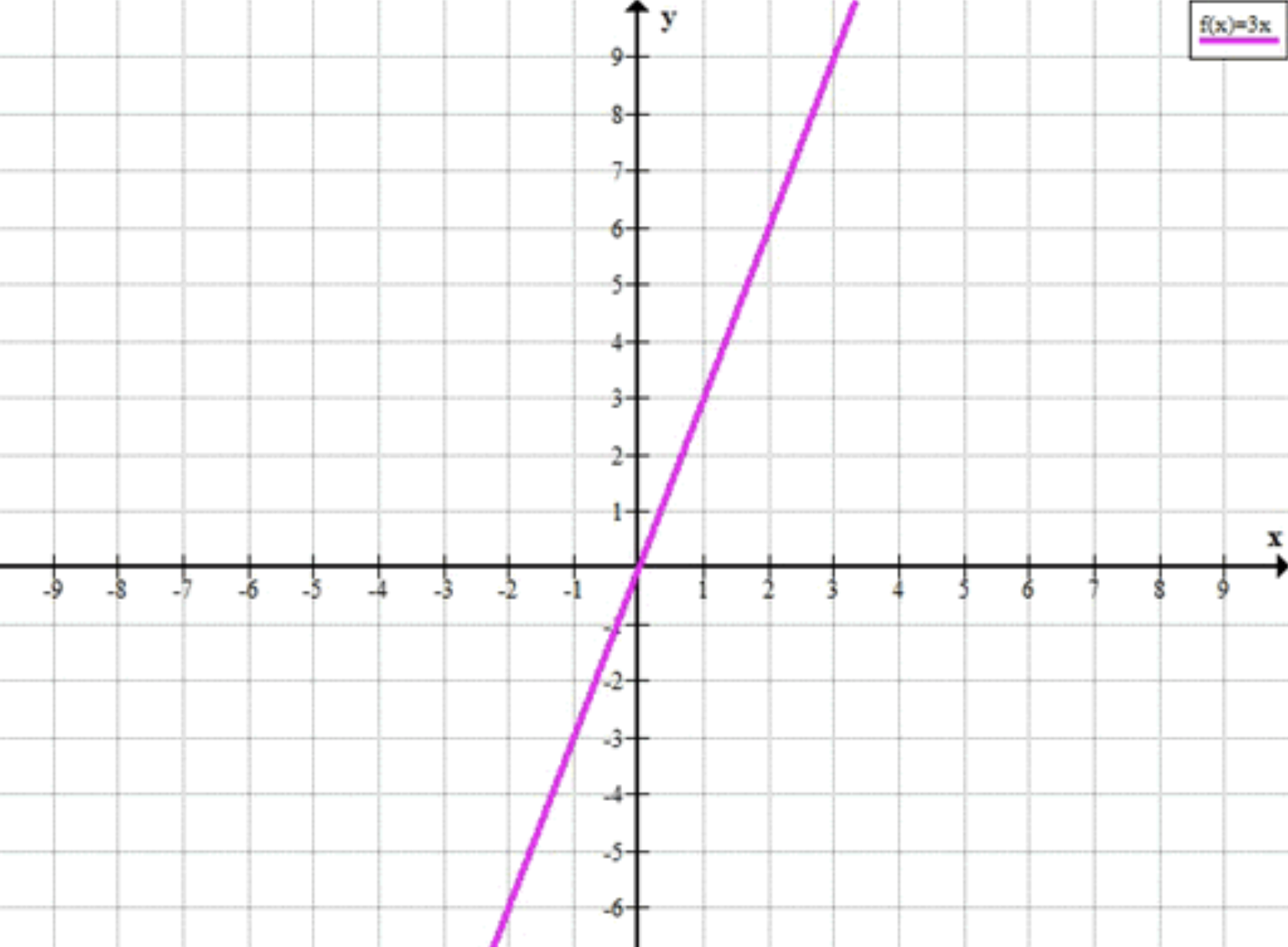 Это линейная функция с уравнением \( y = 3x \), где коэффициент наклона \( k = 3 \), а свободный член \( b = 0 \). График этой функции будет прямой линией, проходящей через начало координат \( (0, 0) \). Наклон линии равен 3, что означает, что при увеличении значения \( x \) на 1, значение \( y \) увеличивается на 3. График будет восходящей прямой, проходящей через такие точки, как \( (1, 3) \), \( (2, 6) \), \( (3, 9) \), и т. д. Линия будет продолжаться в обоих направлениях от начала координат.