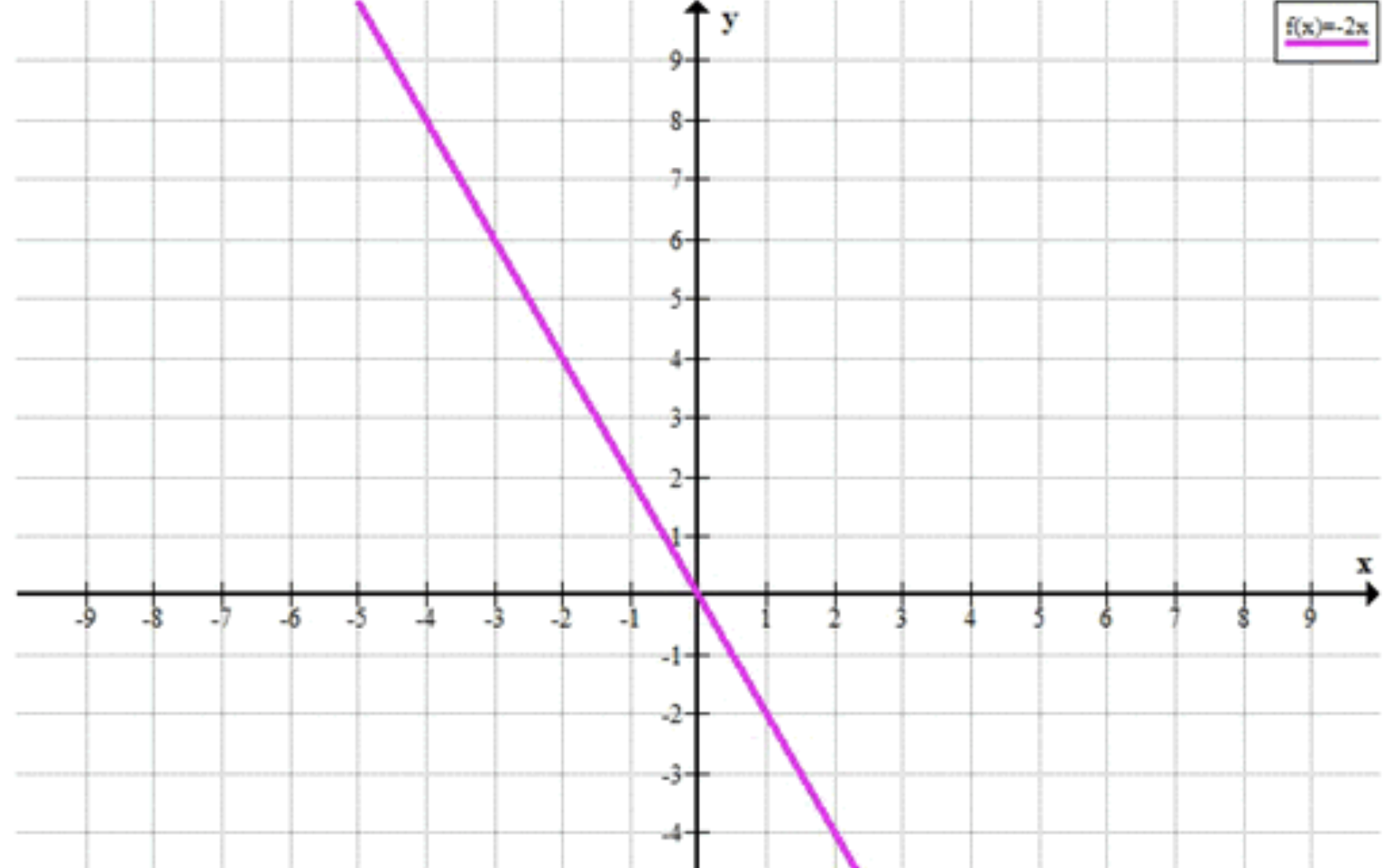 Это линейная функция с уравнением \( y = -2x \), где коэффициент наклона \( k = -2 \), а свободный член \( b = 0 \). График этой функции также будет прямой линией, проходящей через начало координат \( (0, 0) \). Наклон линии равен -2, что означает, что при увеличении значения \( x \) на 1, значение \( y \) уменьшается на 2. График будет убывающей прямой, проходящей через такие точки, как \( (1, -2) \), \( (2, -4) \), \( (3, -6) \), и т. д. Линия будет продолжаться в обоих направлениях, проходя через начало координат.
