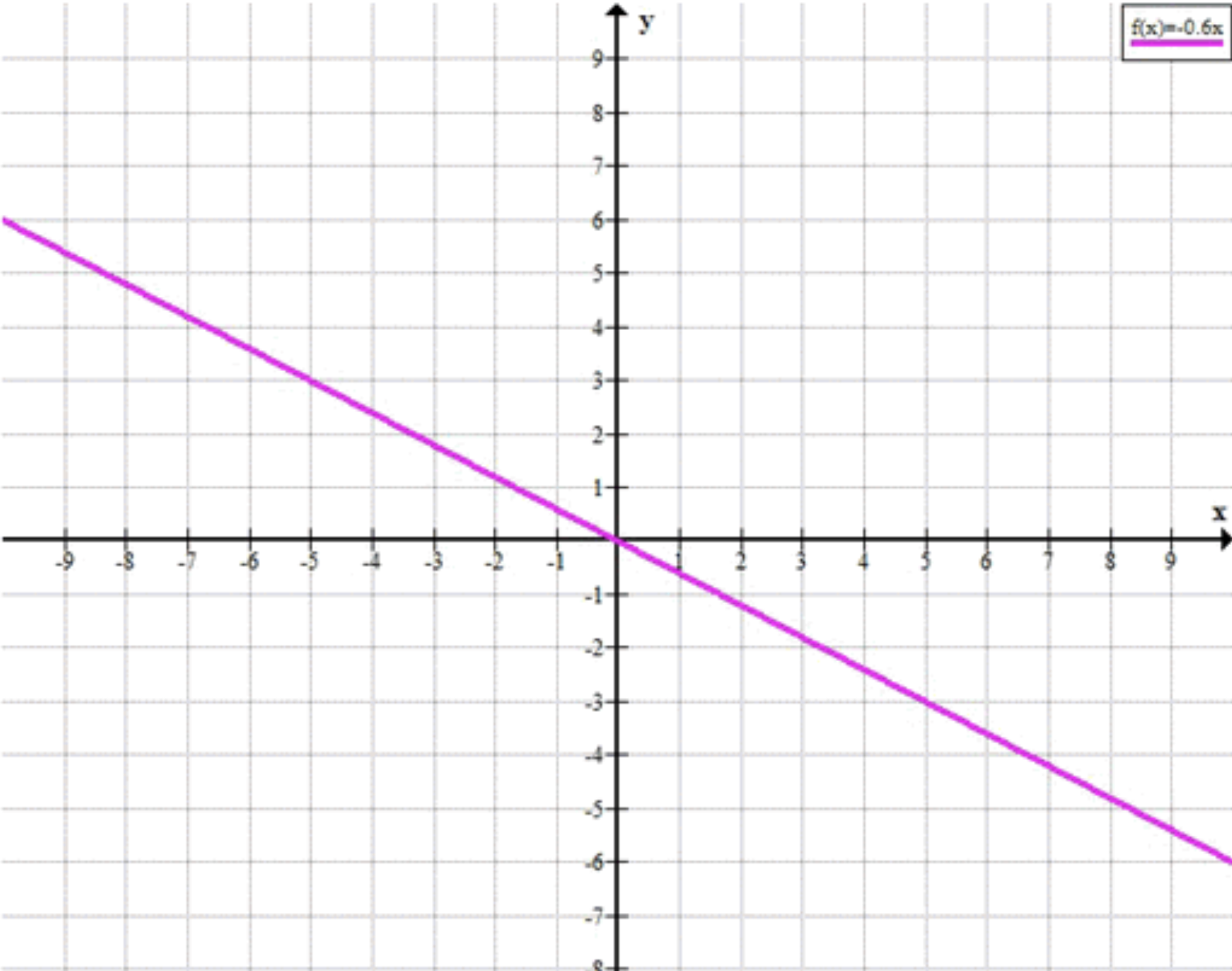 Это линейная функция с уравнением \( y = -0,6x \), где коэффициент наклона \( k = -0,6 \), а свободный член \( b = 0 \). График этой функции также будет прямой линией, проходящей через начало координат \( (0, 0) \). Наклон линии равен -0,6, что означает, что при увеличении значения \( x \) на 1, значение \( y \) уменьшается на 0,6. График будет убывающей прямой, но с менее крутым наклоном, чем в случае функции \( y = -2x \). График будет проходить через такие точки, как \( (1, -0,6) \), \( (2, -1,2) \), \( (3, -1,8) \), и т. д.