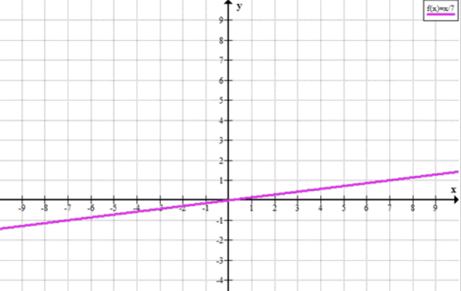 Это линейная функция с уравнением \( y = \frac{1}{7}x \), где коэффициент наклона \( k = \frac{1}{7} \), а свободный член \( b = 0 \). График этой функции также будет прямой линией, проходящей через начало координат \( (0, 0) \). Наклон линии равен \( \frac{1}{7} \), что означает, что при увеличении значения \( x \) на 7, значение \( y \) увеличится на 1. График будет восходящей прямой, но с очень пологим наклоном, проходящий через такие точки, как \( (7, 1) \), \( (14, 2) \), \( (21, 3) \), и т. д. Линия будет продолжаться в обоих направлениях.