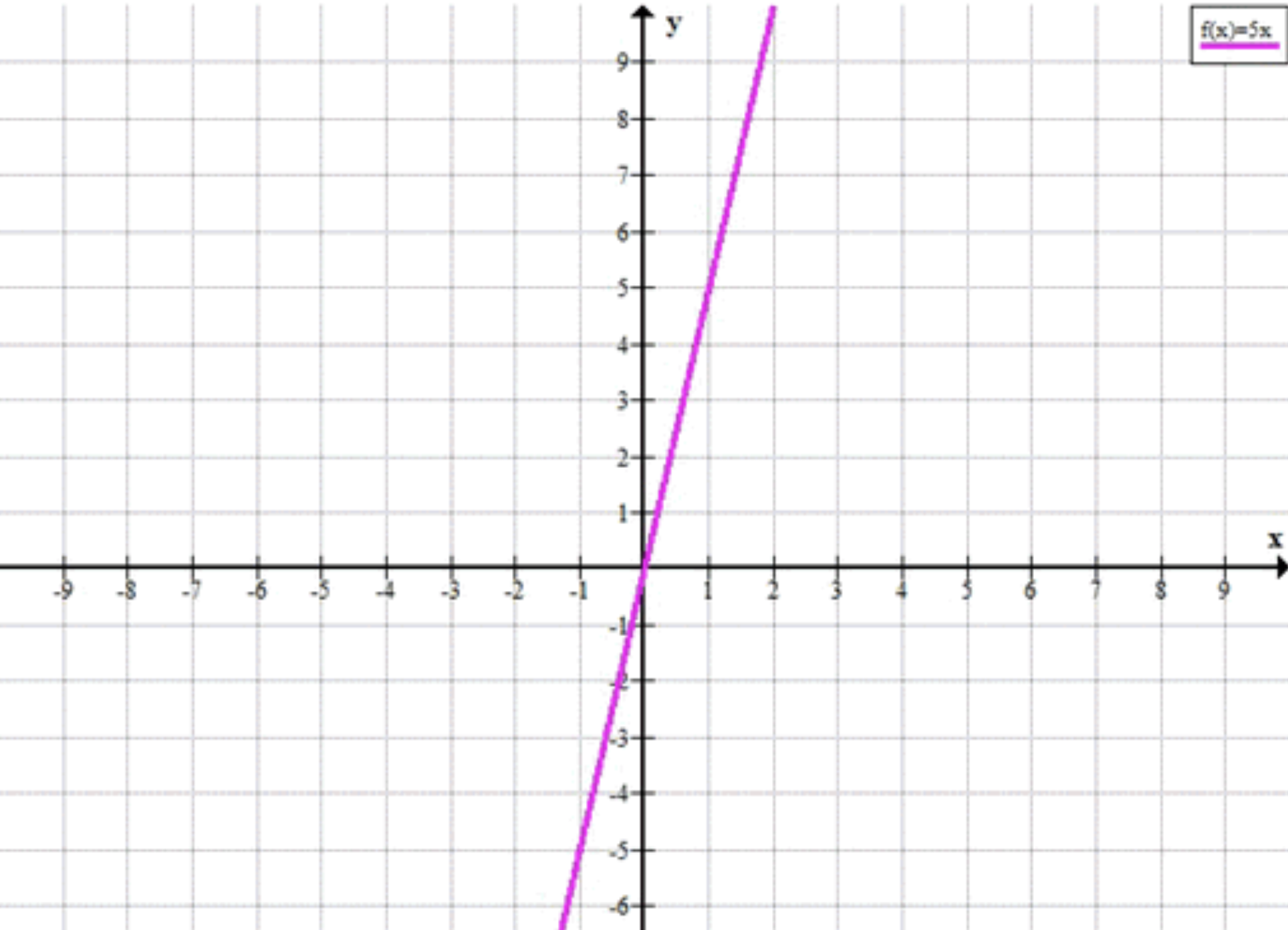Это линейная функция, где коэффициент наклона \( k = 5 \), а свободный член \( b = 0 \). График этой функции будет прямой линией, проходящей через начало координат \( (0, 0) \). Наклон линии равен 5, что означает, что для каждого увеличения \( x \) на 1, значение \( y \) увеличивается на 5. График будет восходящей прямой, проходящей через такие точки, как \( (1, 5) \), \( (2, 10) \), \( (3, 15) \), и т. д. Линия будет продолжаться в обоих направлениях, проходя через начало координат. Чем больше значение \( x \), тем выше будет точка на графике.