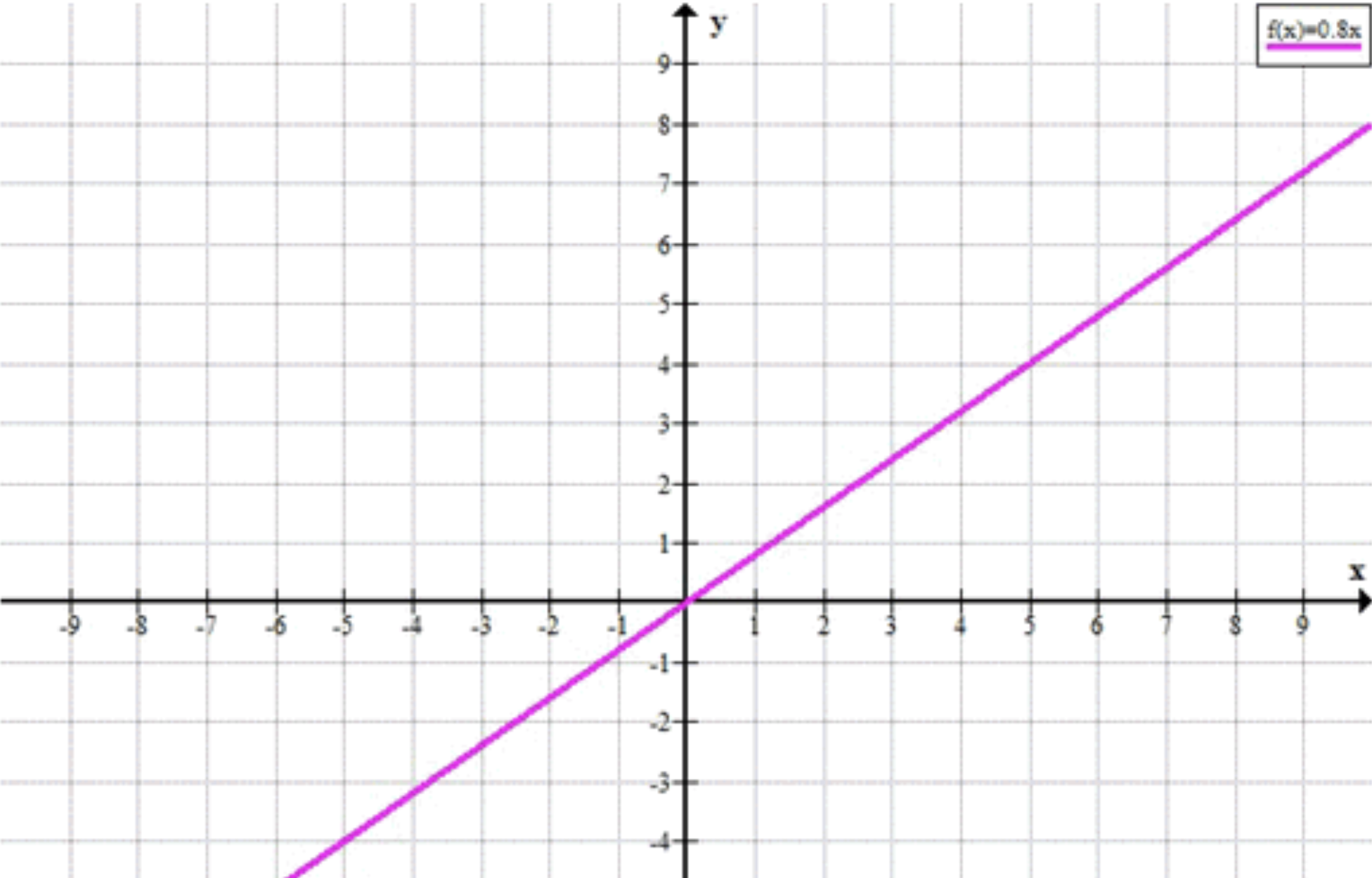 Это также линейная функция, где коэффициент наклона \( k = 0,8 \), а свободный член \( b = 0 \). График этой функции будет прямой линией, проходящей через начало координат \( (0, 0) \). Наклон линии равен 0,8, что означает, что для каждого увеличения \( x \) на 1, значение \( y \) будет увеличиваться на 0,8. График будет восходящей прямой, но с меньшим наклоном по сравнению с функцией \( y = 5x \). Он будет проходить через такие точки, как \( (1, 0,8) \), \( (2, 1,6) \), \( (3, 2,4) \), и т. д. Линия будет продолжаться в обоих направлениях, проходя через начало координат.