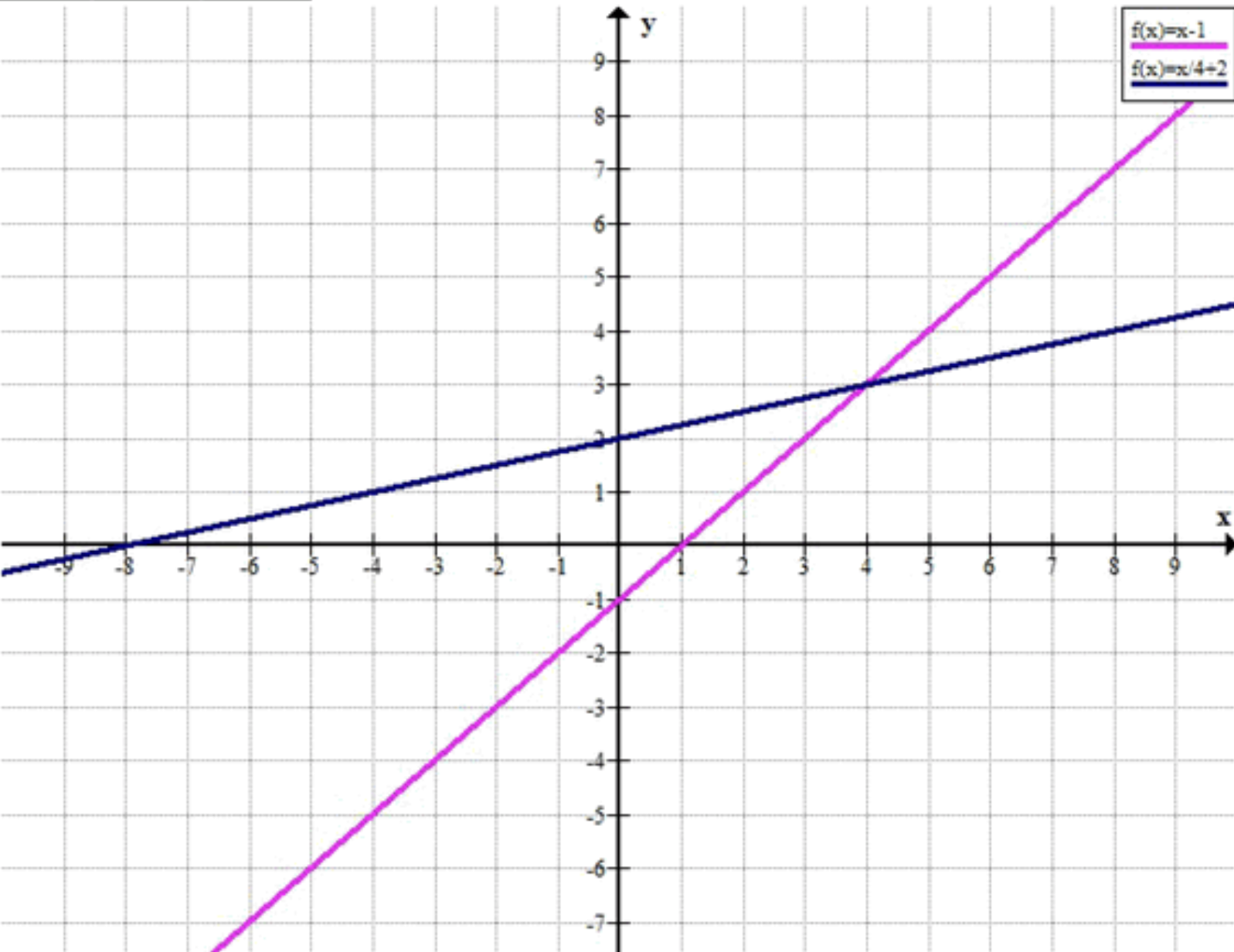 Графики обеих функций будут прямыми линиями. Прямая \( y = x — 1 \) будет подниматься с более крутым наклоном, начиная с точки \( (0; -1) \), а прямая \( y = \frac{1}{4}x + 2 \) будет более пологой, начинаясь с точки \( (0; 2) \). Точки пересечения этих графиков будут находиться в точке \( (4; 3) \), как показано выше.