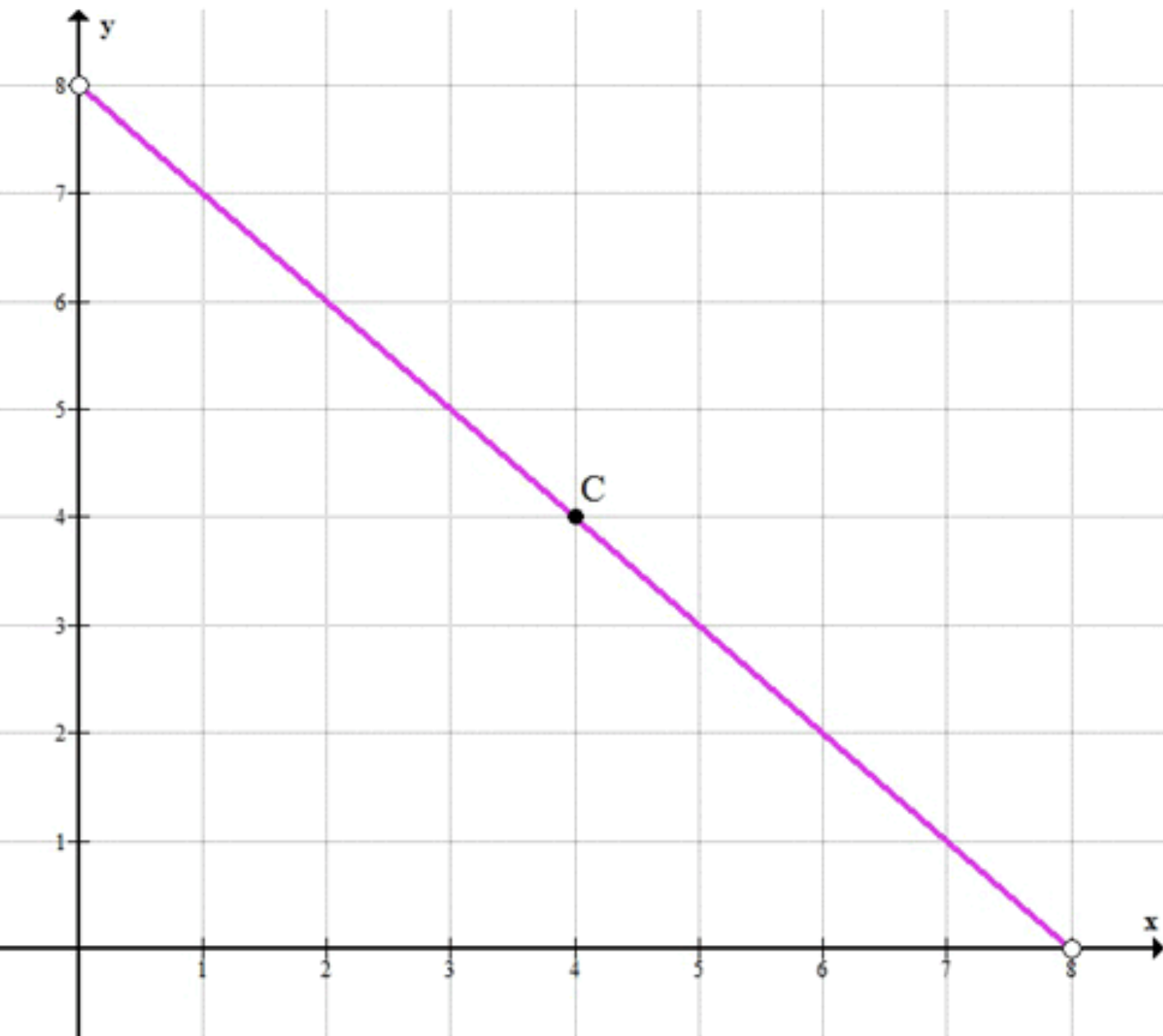 График представляет собой прямую линию, проходящую через точки \((0, 8)\) и \((8, 0)\), с наклоном -1. Точка \((4, 4)\) — это точка, в которой точка \(C\) является серединой отрезка \(AB\). В этой точке длина отрезка \(AC\) равна длине отрезка \(BC\), и обе равны 4.