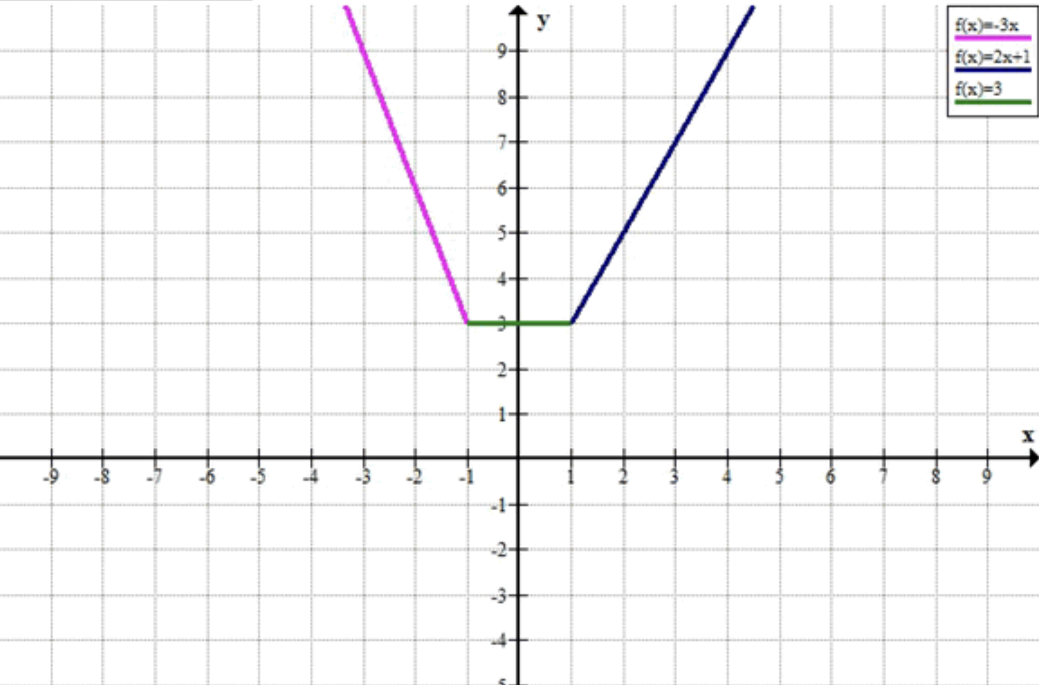 \(y = \begin{cases} -3x, & \text{если } x \le -1 \\ 3, & \text{если } -1 < x < 1 \\ 2x + 1, & \text{если } x \ge 1 \end{cases}\)