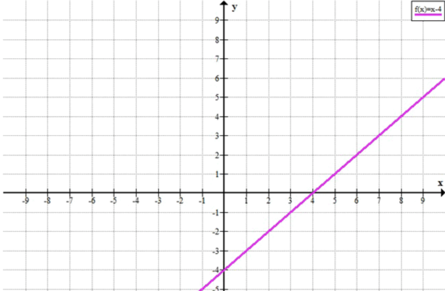 График этого уравнения представляет собой прямую линию с угловым коэффициентом 1, которая пересекает ось \( y \) в точке \( (0; -4) \). Линия имеет положительный наклон, так как угловой коэффициент равен 1.