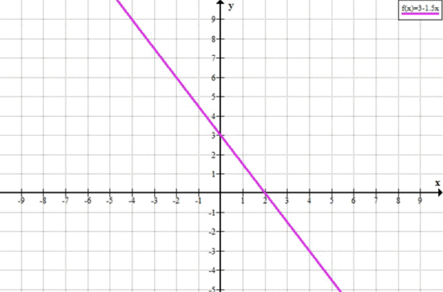 График этого уравнения представляет собой прямую линию с угловым коэффициентом \( -1,5 \). Линия пересекает ось \( y \) в точке \( (0; 3) \) и имеет отрицательный наклон, так как угловой коэффициент отрицателен.