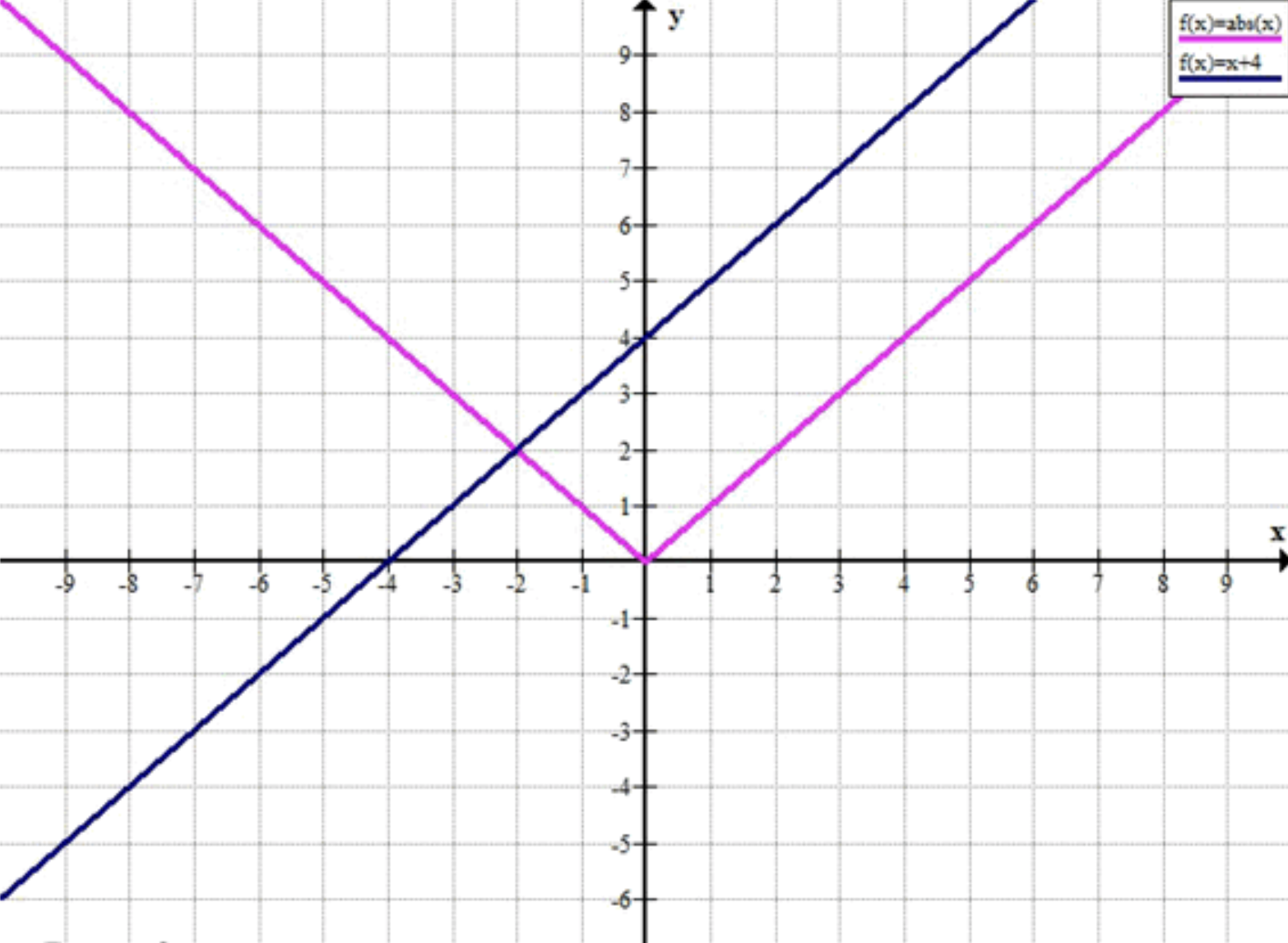 На графике \( y = |x| \) мы видим, что это «V»-образная функция, которая симметрична относительно оси \( y \). Она пересекает ось \( y \) в точке \( (0, 0) \), и её вершина находится в этой точке. График \( y = x + 4 \) представляет собой прямую линию с наклоном 1, которая пересекает ось \( y \) в точке \( (0, 4) \).