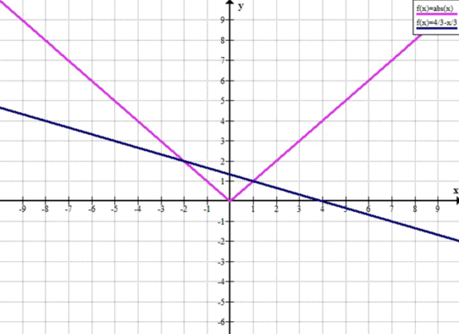 График функции \( y = |x| \) будет «V»-образным, а график \( y = \frac{4}{3} — \frac{1}{3}x \) будет прямой с отрицательным наклоном, которая пересекает ось \( y \) в точке \( \left(0, \frac{4}{3}\right) \). Мы видим, что эти графики пересекаются в двух точках: \( (-2; 2) \) и \( (1; 1) \).
