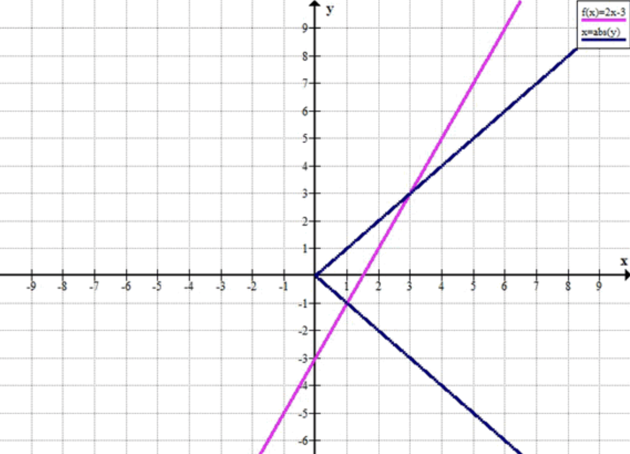 График функции \( x = |y| \) будет представлять собой две прямые, одну с положительным наклоном и одну с отрицательным наклоном, которые пересекаются на оси \( x \). График \( y = 2x — 3 \) будет прямой с наклоном 2, которая пересекает ось \( y \) в точке \( (0, -3) \). Эти графики пересекаются в двух точках: \( (3; 3) \) и \( (1; -1) \).