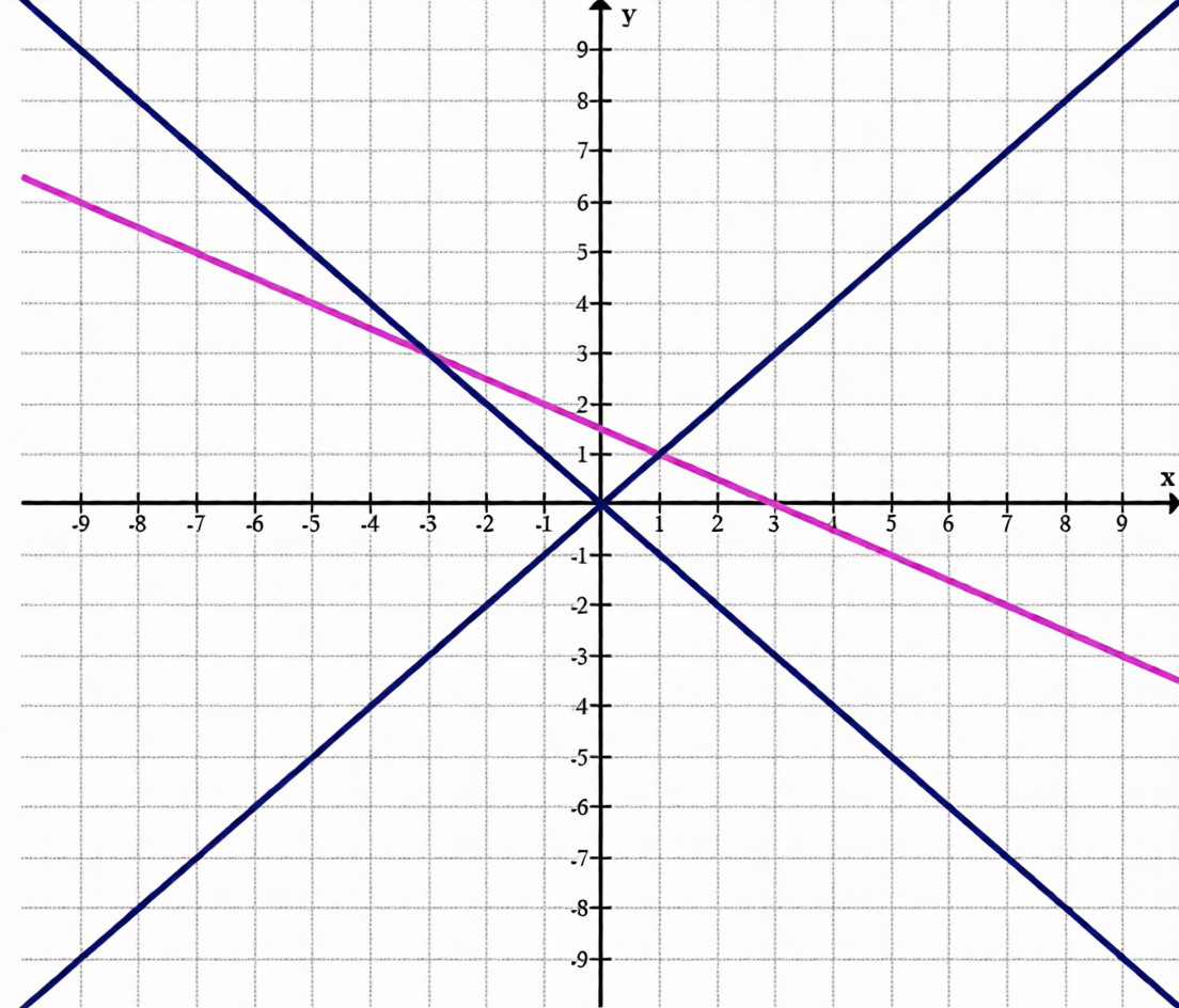 — Прямая \( y = -x \) — линия с углом наклона -45 градусов, также проходящая через начало координат.