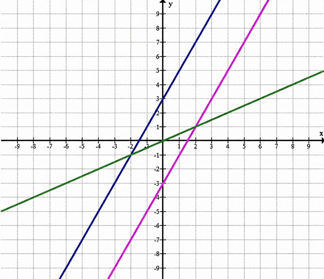 — Прямая \( y = 2x — 3 \) — линия с углом наклона 2, пересекающая ось \( y \) в точке \( y = -3 \).