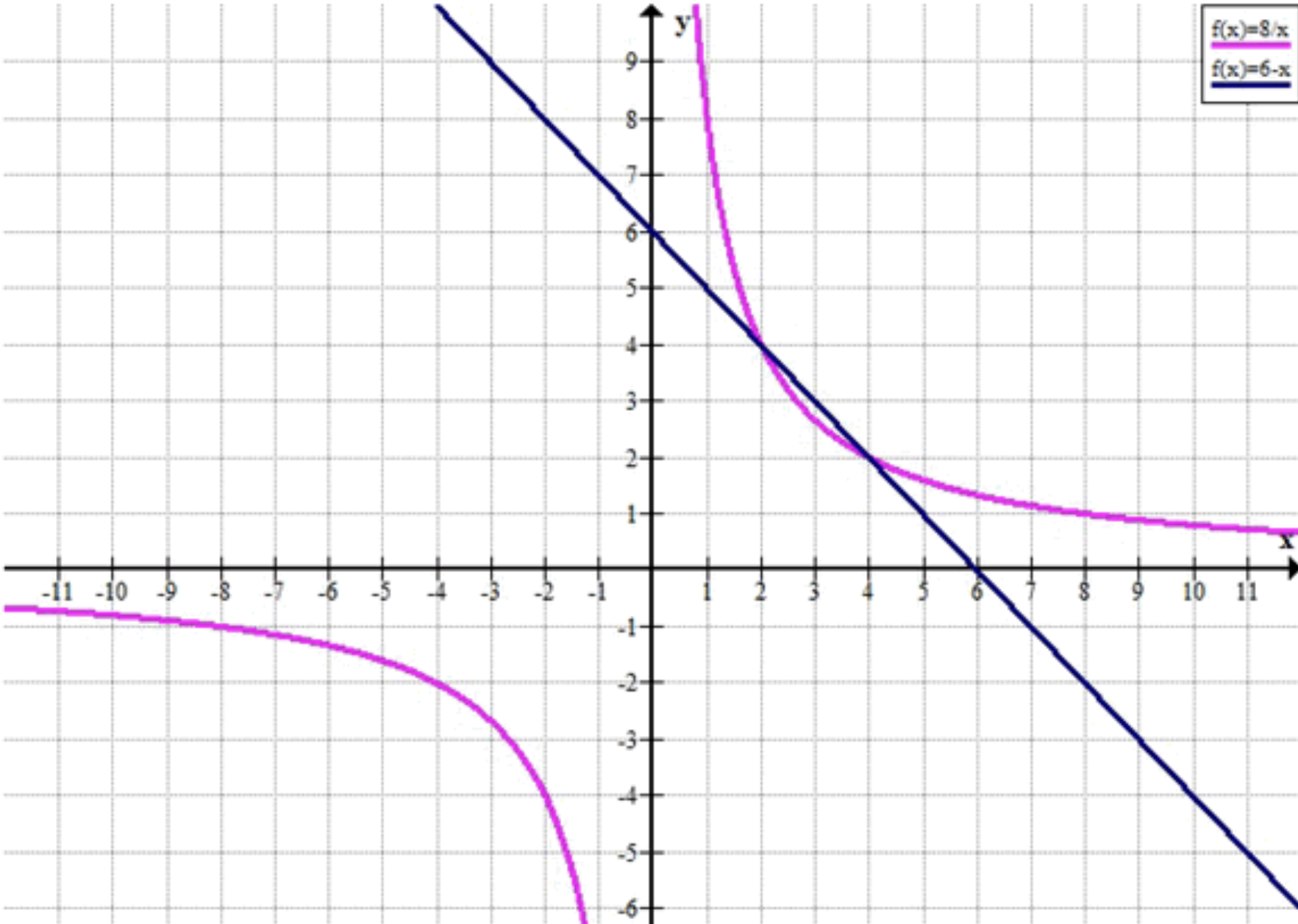 \( y = \frac{8}{x} \) и \( y = 6 — x \).