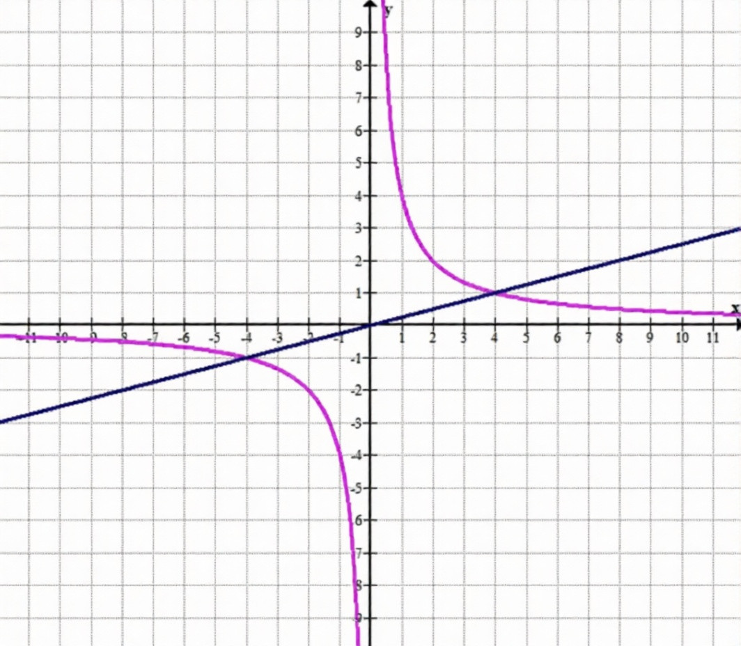 Ответ: точки пересечения графиков находятся в точках \( (-4; -1) \) и \( (4; 1) \).
