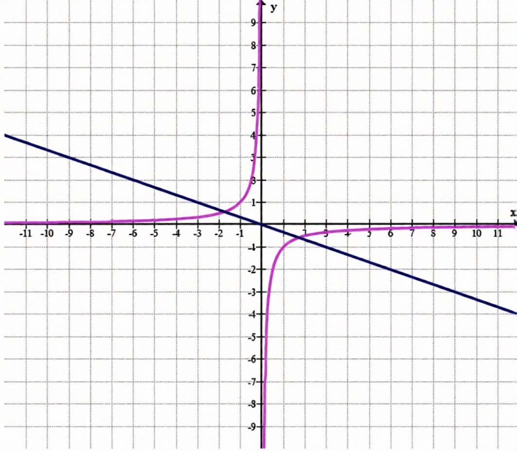 График функции \( y = -\frac{1}{x} \) представляет собой гиперболу, расположенную в первой и третьей четвертях. График функции \( y = -\frac{x}{3} \) — это прямая линия с угловым коэффициентом -1/3, пересекающая ось \( y \) в точке (0, 0). Графики этих функций пересекаются в двух точках: \( (-2; 0,5) \) и \( (1; -1) \).