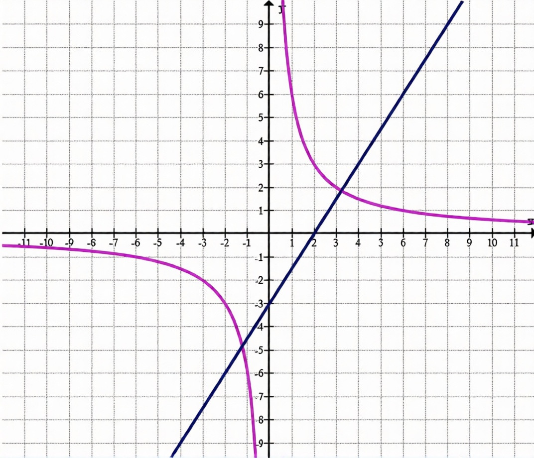 График функции \( y = \frac{6}{x} \) представляет собой гиперболу, расположенную в первой и третьей четвертях. График функции \( y = 1,5x — 3 \) — это прямая линия с угловым коэффициентом 1,5, пересекающая ось \( y \) в точке (0, -3). Эти функции пересекаются в двух точках: \( (-6; -1) \) и \( (2; 3) \).
