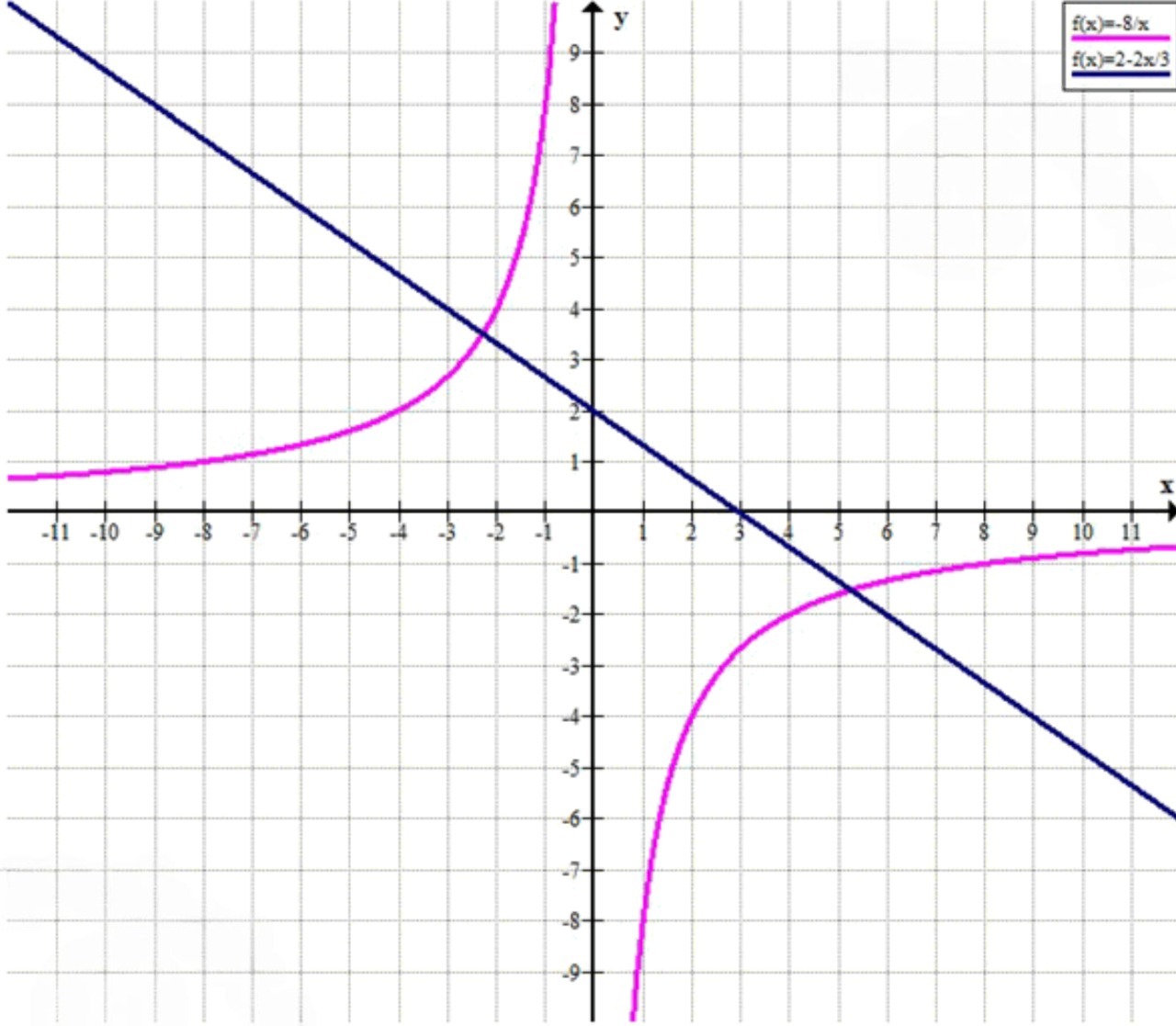 1) \( \begin{cases} xy = -8 \\ 2x + 3y = 6 \end{cases} \quad \begin{cases} y = -\frac{8}{x} \\ 3y = 6 — 2x \quad \Rightarrow \quad y = 2 — \frac{2}{3}x \end{cases} \)