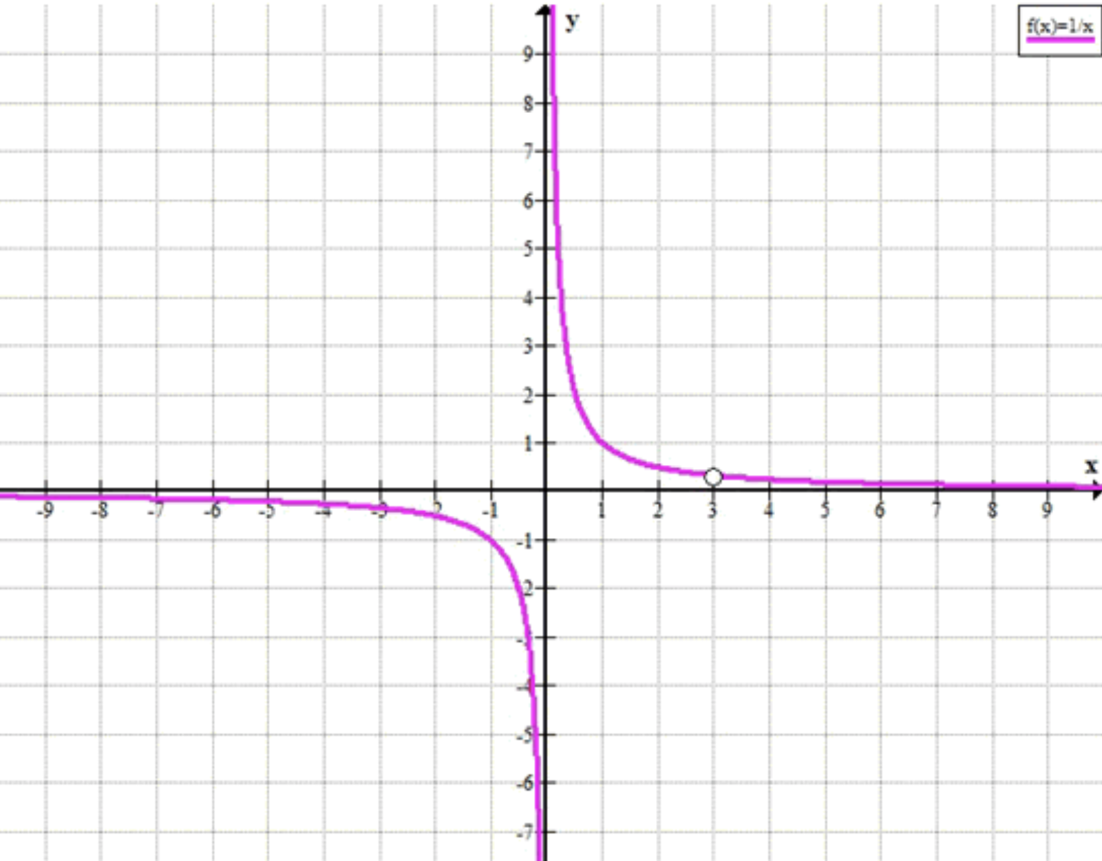 График функции \( y = \frac{1}{x} \) представляет собой гиперболу, с двумя асимптотами: вертикальной асимптотой \( x = 0 \) и горизонтальной асимптотой \( y = 0 \). Функция не определена в точке \( x = 0 \), так как в знаменателе находится переменная \( x \), и дробь не существует при \( x = 0 \). Функция также не определена в точке \( x = 3 \), поскольку при \( x = 3 \) числитель и знаменатель обнуляются.