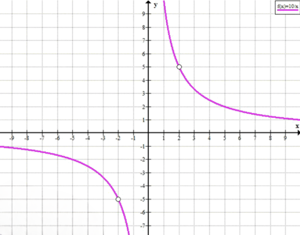 \( y = \frac{10}{x}, \quad x \neq 0 \text{ и } x \neq \pm 2 \)
