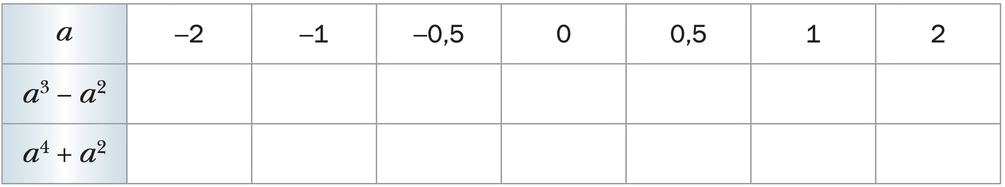 Заполним таблицу значений, последовательно вычисляя выражения \(a^3 — a^2\) и \(a^4 + a^2\) для каждого заданного значения переменной \(a\).