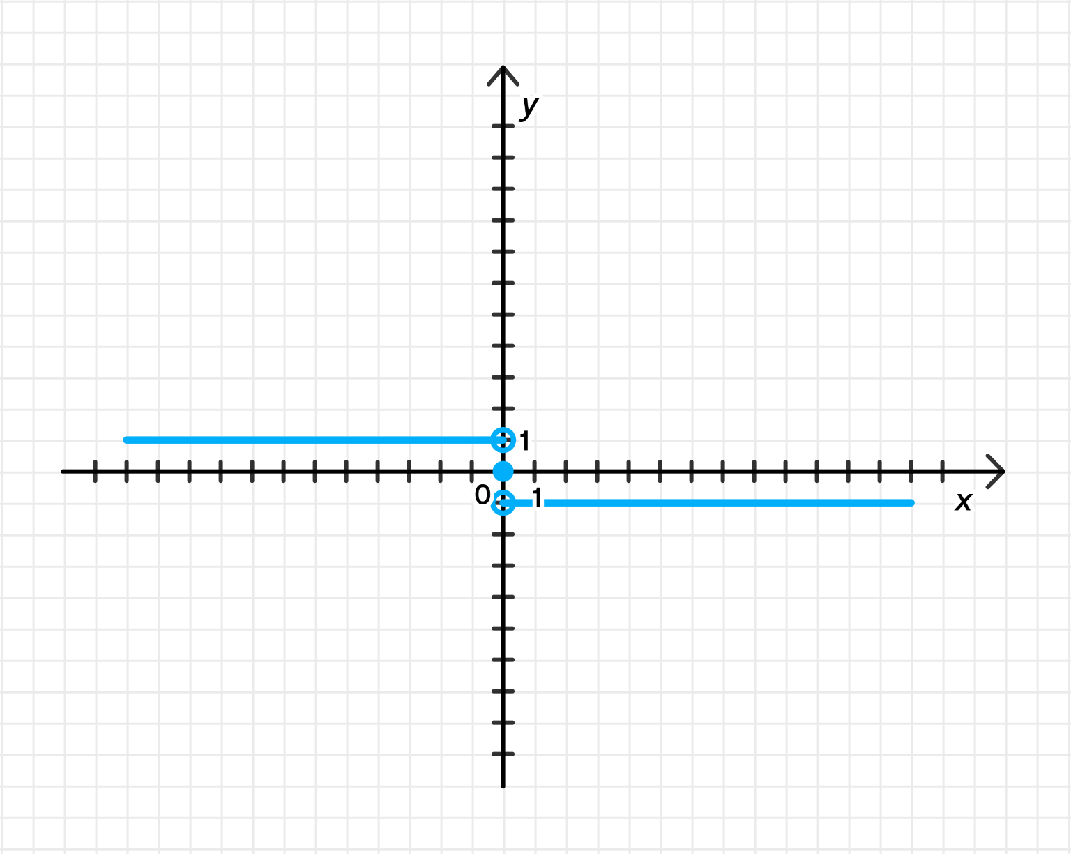 - Горизонтальная линия на уровне \(y = -1\) для всех \(x > 0\), с открытым кружком в точке \(x = 0\).