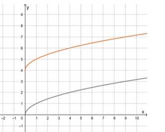 Во втором случае рассматривается \(f_{2}(x)=\sqrt{x}+4\). Здесь каждая точка графика \(y=\sqrt{x}\) сдвигается вверх на 4 единицы, вследствие чего область определения остаётся \(x\ge0\), а область значений изменяется на \(y\ge4\). Преобразование не меняет форму корня, лишь повышает все значения функции на одинаковую величину.