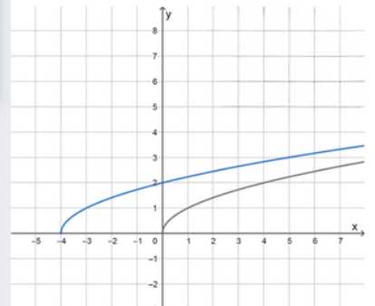 4) Графически преобразования функции \(g(x)=\sqrt{x}\) отражаются в двух случаях. В первом случае рассматривается \(f_{1}(x)=\sqrt{x+4}\). Это означает, что каждому значению аргумента \(t\ge0\), для которого \(g(t)=\sqrt{t}\) определена, соответствует точка \((t-4,\sqrt{t})\). Таким образом, базовую кривую \(y=\sqrt{x}\) сдвигают на 4 единицы влево: область определения становится \(x\ge-4\), а начальной точкой графика теперь будет \((-4,\,0)\).