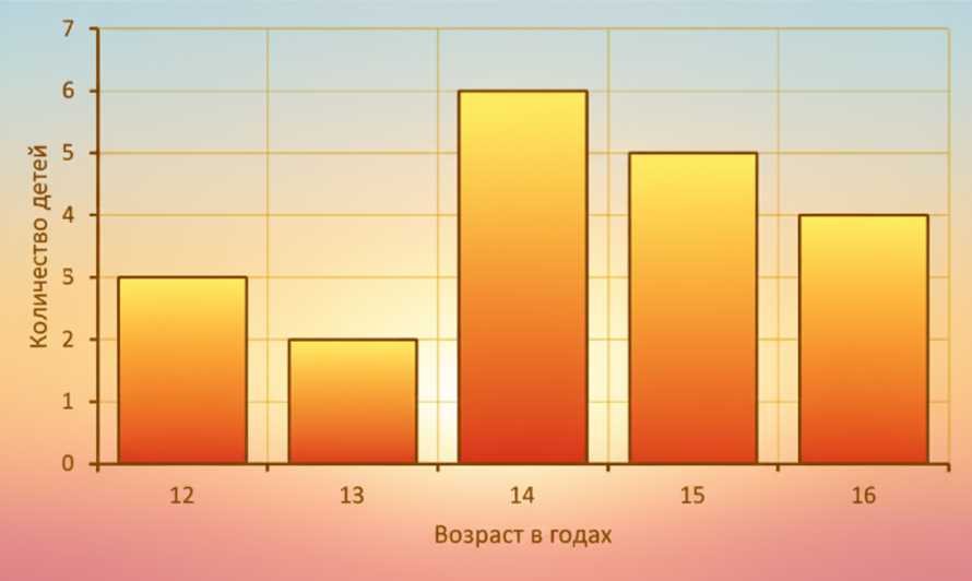Далее подсчитаем количество детей для каждого возраста. Возраст 12 лет встречается 3 раза: это первый, четвертый и тринадцатый ребенок. Возраст 13 лет встречается 2 раза: восьмой и единственный раз. Возраст 14 лет встречается 6 раз: третий, пятый, шестой, восемнадцатый, девятнадцатый и двадцатый ребенок. Возраст 15 лет встречается 5 раз: седьмой, девятый, одиннадцатый, двенадцатый и четырнадцатый ребенок. Возраст 16 лет встречается 4 раза: десятый, пятнадцатый, шестнадцатый и семнадцатый ребенок. Таким образом, для каждого возраста записываем частоту — количество детей.