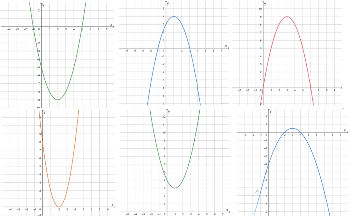 Постройте график функции: 1) \(y = x^2 — 4x — 5\); 2) \(y = -x^2 + 2x + 3\); 3) \(y = 6x — x^2\); 4) \(y = x^2 — 8x + 8\); 5) \(y = x^2 — 2x + 4\); 6) \(y = x^2 + 3x — 4\).