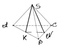 4. Рассмотрим треугольник \( \triangle SKV \). Известно, что \( K \) и \( V \) — середины сторон основания, значит \( KV \) — средняя линия треугольника \( ABC \).