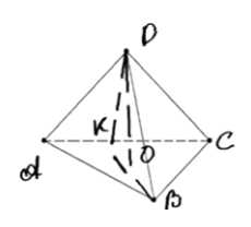 6. Для нахождения высоты пирамиды рассмотрим треугольник \(DOK\). Высота \(DO\) — это катет треугольника, противолежащий углу \(30^\circ\). По свойствам прямоугольного треугольника: \(DO = DK \cdot \sin 30^\circ = \frac{4\sqrt{3}}{3} \cdot \frac{1}{2} = \frac{2\sqrt{3}}{3}\) см.