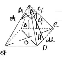 Для начала рассмотрим высоту пирамиды. Высота усечённой пирамиды — это расстояние между плоскостями оснований, перпендикулярное к ним. В данной задаче высоту можно найти через высоту полной пирамиды, из которой усечена верхняя часть. Высота полной правильной четырёхугольной пирамиды равна длине от центра основания до вершины, перпендикулярной к основанию. Для усечённой пирамиды высота равна разности высот двух таких пирамид с основаниями 27 см и 15 см соответственно. Диагональ квадрата основания со стороной \(a\) равна \(a \sqrt{2}\). Половина диагонали — это расстояние от центра основания до середины стороны, то есть \(\frac{a \sqrt{2}}{2} = \frac{a}{\sqrt{2}}\).