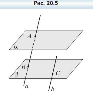Известно, что \(a \parallel \beta\), \(a \parallel b\). Прямая \(a\) пересекает плоскость \(\alpha\) в точке \(A\), плоскость \(\beta\) — в точке \(B\), а прямая \(b\) пересекает плоскость \(\beta\) в точке \(C\) (рис. 20.5). Постройте точку пересечения прямой \(b\) и плоскости \(\alpha\).
