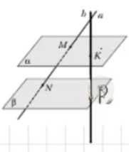 5. Чтобы найти точку пересечения прямой \(b\) с плоскостью \(\beta\), необходимо перенести точку \(K\) из плоскости \(\alpha\) в плоскость \(\beta\) вдоль направления вектора \( \overrightarrow{MN} \).