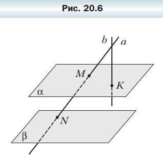 Даны параллельные плоскости \(\alpha\) и \(\beta\) и пересекающиеся прямые \(a\) и \(b\). Прямая \(a\) пересекает плоскость \(\alpha\) в точке \(M\), плоскость \(\beta\) — в точке \(N\), а прямая \(b\) пересекает плоскость \(\alpha\) в точке \(K\) (рис. 20.6). Постройте точку пересечения прямой \(b\) и плоскости \(\beta\).