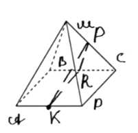 Плоскость сечения параллельна \(ABM\) и проходит через точку \(K\), середину \(AD\). Тогда сечение — треугольник \(PKR\), где \(P\) и \(R\) — точки на ребрах \(BM\) и \(AB\).