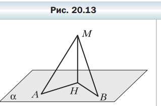 Из точки \(M\) проведены к плоскости \(\alpha\) перпендикуляр \(MH\) и равные наклонные \(MA\) и \(MB\) (рис. 20.13). Найдите расстояние между основаниями наклонных, если \(\angle MAH = 30^\circ\), \(\angle AMB = 60^\circ\), \(MH = 5\) см.