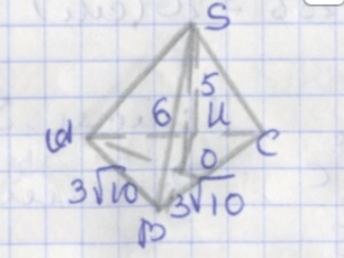 Основанием пирамиды является равнобедренный треугольник, боковая сторона которого равна \(\frac{3}{10}\) см, а основание — 6 см. Высота пирамиды равна 5 см, а её боковые рёбра равны. Найдите боковое ребро пирамиды.