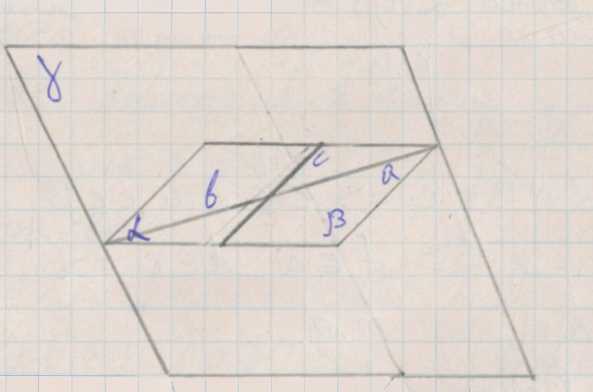 Даны плоскости \(\alpha, \beta, \gamma\) и прямые \(a, b, c\) такие, что \(\alpha \cap \beta = c\), \(\alpha \cap \gamma = b\), \(\beta \cap \gamma = a\).