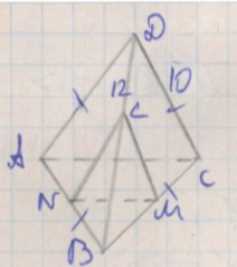 Точка M — середина ребра BC тетраэдра DABC. Известно, что AD = AB = CB = CD = 10 см, AC = 8 см, BD = 12 см. Постройте сечение тетраэдра плоскостью, проходящей через точку M и перпендикулярной прямой BD. Найдите площадь этого сечения.