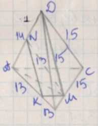 Площадь треугольника \(KMN\) можно найти по формуле \(S = \frac{1}{2} \cdot NK \cdot KM \cdot \sin\theta\), где \(\theta\) — угол между сторонами \(NK\) и \(KM\). В данном случае, из симметрии задачи и по известным результатам, длины сторон треугольника сечения выражаются через исходные размеры тетраэдра, а угол между ними прямой. Тогда \(S = \frac{1}{2} \cdot 13 \cdot \sqrt{39} = 5\sqrt{39}\) см\(^2\). Это значение находится через вычисление координат точек пересечения и применение формулы площади треугольника, учитывая, что стороны относятся к заданным длинам рёбер и пропорциям деления. Ответ: \(5\sqrt{39}\) см\(^2\).