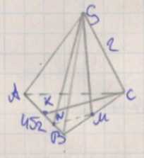 В основании пирамиды \(SABC\) лежит равносторонний треугольник \(ABC\) со стороной \(4\sqrt{2}\) см, \(SC\) — высота, перпендикулярная основанию, длиной 2 см. Точки \(M\) и \(K\) — середины рёбер \(BC\) и \(AB\).
