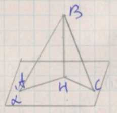 3. Проведём из точки \( B \) две наклонные к плоскости: \( BA \) и \( BC \). Их проекции на плоскость — это отрезки \( AH \) и \( HC \), соответственно.