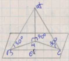 Угол между наклонной и её проекцией \( 30^\circ \): \( \cos 30^\circ = \frac{BH}{AB} \), то есть \( \frac{3\sqrt{2}}{AB} = \frac{\sqrt{3}}{2} \), отсюда \( AB = AC = \frac{3\sqrt{2} \cdot 2}{\sqrt{3}} = 2\sqrt{6} \).