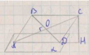 AC и BD – диагонали ромба, CD – сторона. Пусть проекция BC на плоскость α – точка B’, расстояние от BC до α – 3 см.