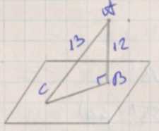 Пусть из точки к плоскости проведён перпендикуляр \(AB\) длиной \(12\) см и наклонная \(AC\) длиной \(13\) см. Требуется найти длину проекции наклонной \(AC\) на плоскость, то есть отрезок \(CB\), где \(B\) — основание перпендикуляра, а \(C\) — основание наклонной на плоскости.
