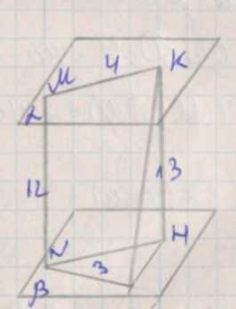 Плоскости α и β параллельны. Точки M и K принадлежат плоскости α, а точки N и F — плоскости β. Известно, что MN ⊥ β, MN = 12 см, MK = 4 см, NF = 3 см, KF = 13 см. Найдите расстояние между прямыми MN и KF.