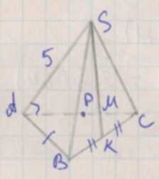 \( \rho = \frac{|\overrightarrow{SB} \cdot (\overrightarrow{SK} \times \overrightarrow{BM})|}{|\overrightarrow{SK} \times \overrightarrow{BM}|} = \frac{20}{13} \) см.