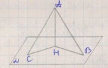 1. Пусть из точки \(A\) к плоскости проведены две наклонные \(AC\) и \(AB\), а их проекции на плоскость — отрезки \(CH\) и \(CB\).