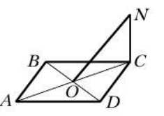 Пусть дан квадрат \(ABCD\), лежащий в некоторой плоскости. Диагональ \(BD\) — это отрезок, соединяющий противоположные вершины квадрата, и он целиком принадлежит плоскости квадрата. Пусть \(N\) — точка вне плоскости квадрата, а \(NC\) — прямая, проходящая через точку \(N\) и точку \(C\), причём \(NC\) перпендикулярна плоскости квадрата \(ABCD\). Обозначим точку пересечения прямой \(NC\) с плоскостью квадрата как \(O\), и рассмотрим прямую \(NO\), которая лежит на \(NC\).